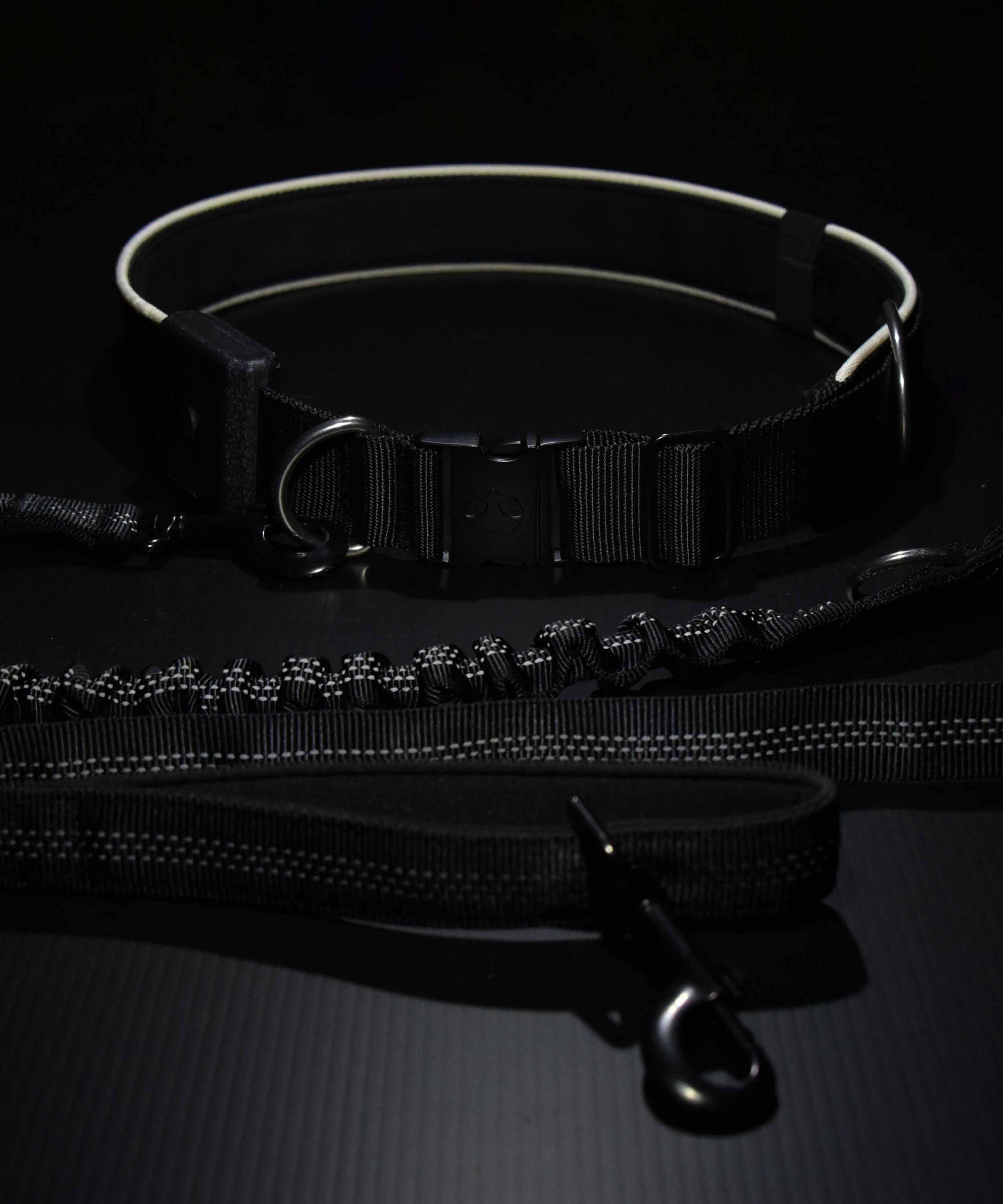 Hands-free dog leash set with adjustable black belt and shock-absorbing bungee leash for running, hiking, or daily walks.