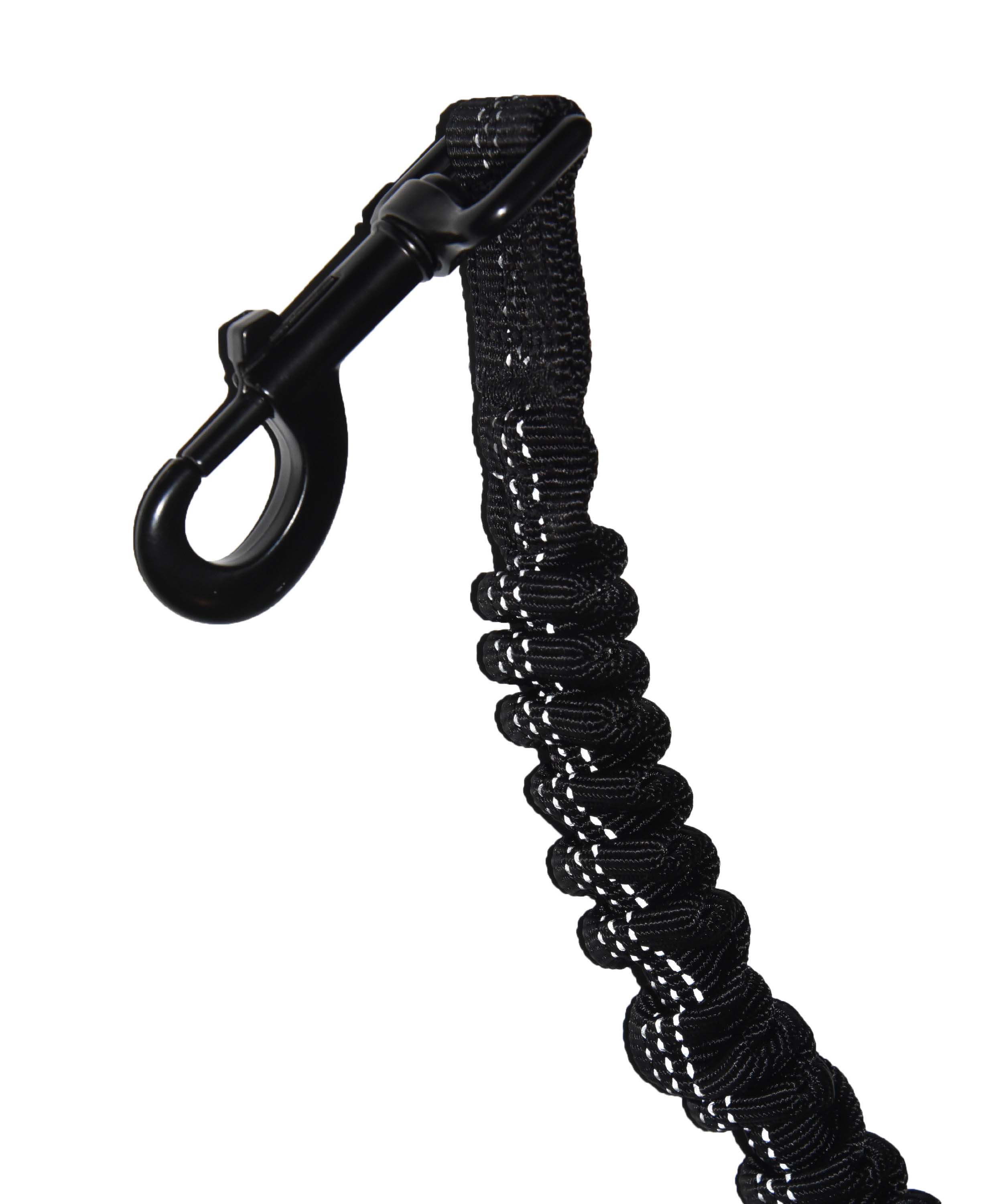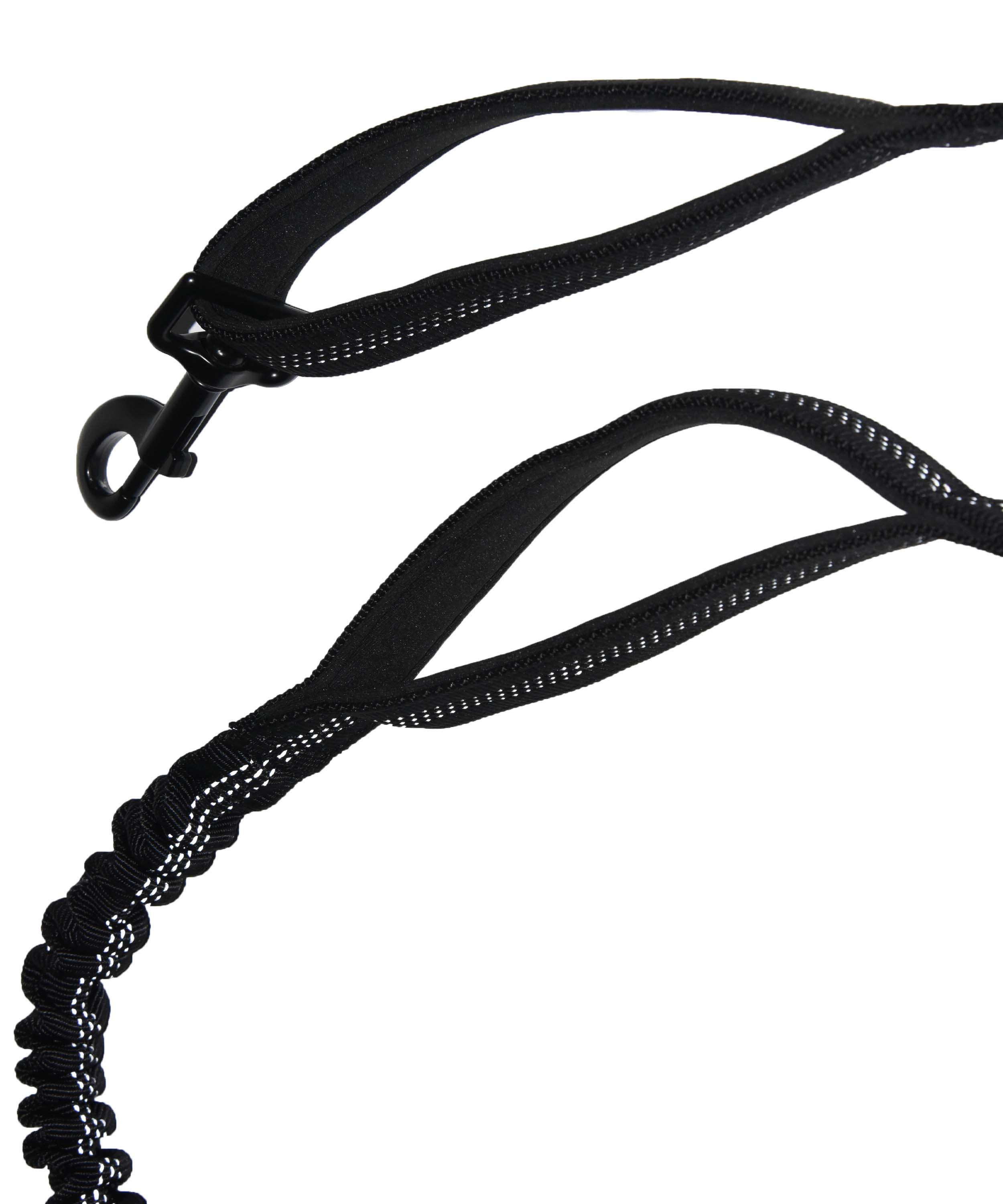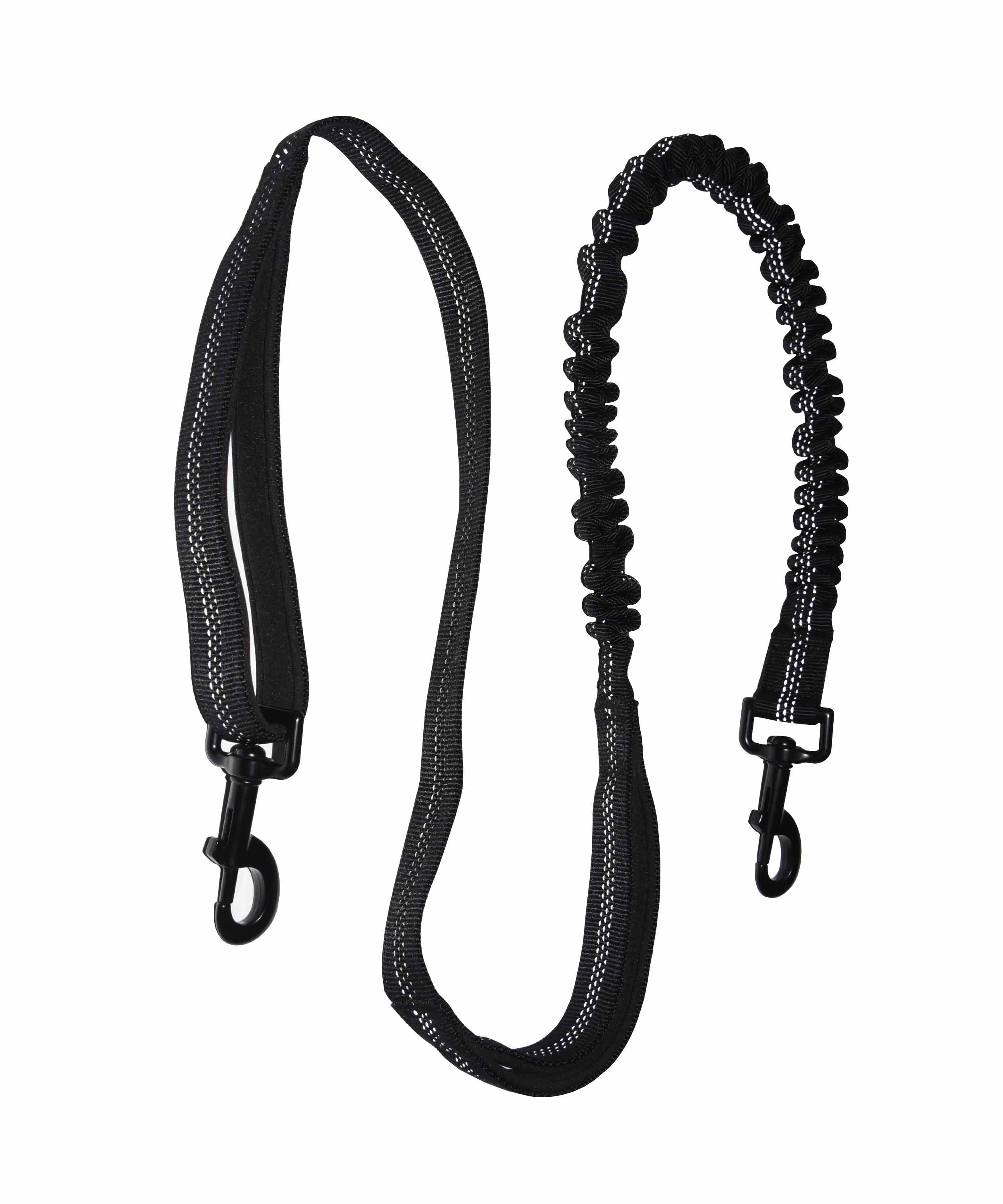 This 4 ft leash features 18" of bungee stretch to absorb pulling and give your dog a bit more freedom. With leash clips on both sides of the leash it can be used to attach to a hands free belt or as a regular leash. It has two padded handles—one for everyday use and a traffic handle in the middle to keep your dog close when needed. Use it on its own or clip it to our hands-free belt for added convenience.